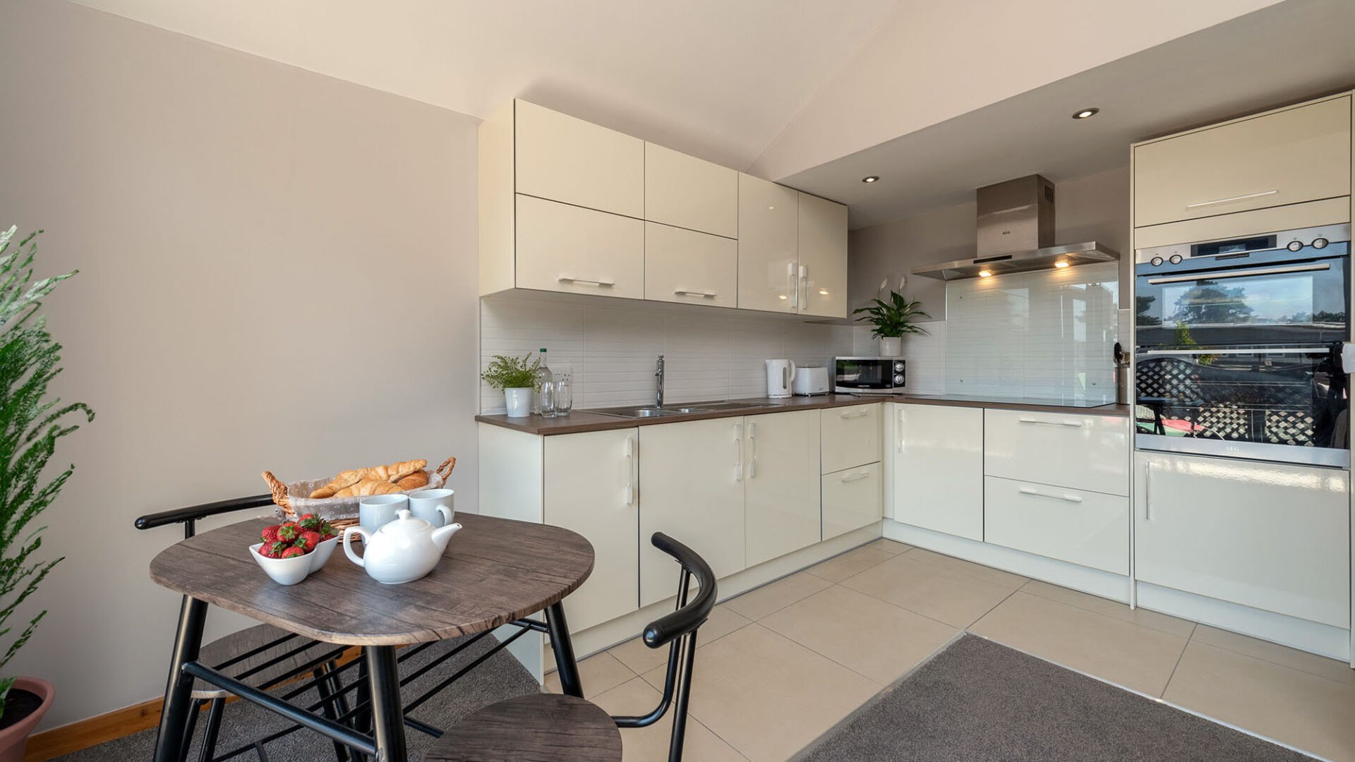 - Lounge and fully equipped kitchen, double oven, hob, fridge, microwave, lots of storage and a table and chairs for dinning inside.
