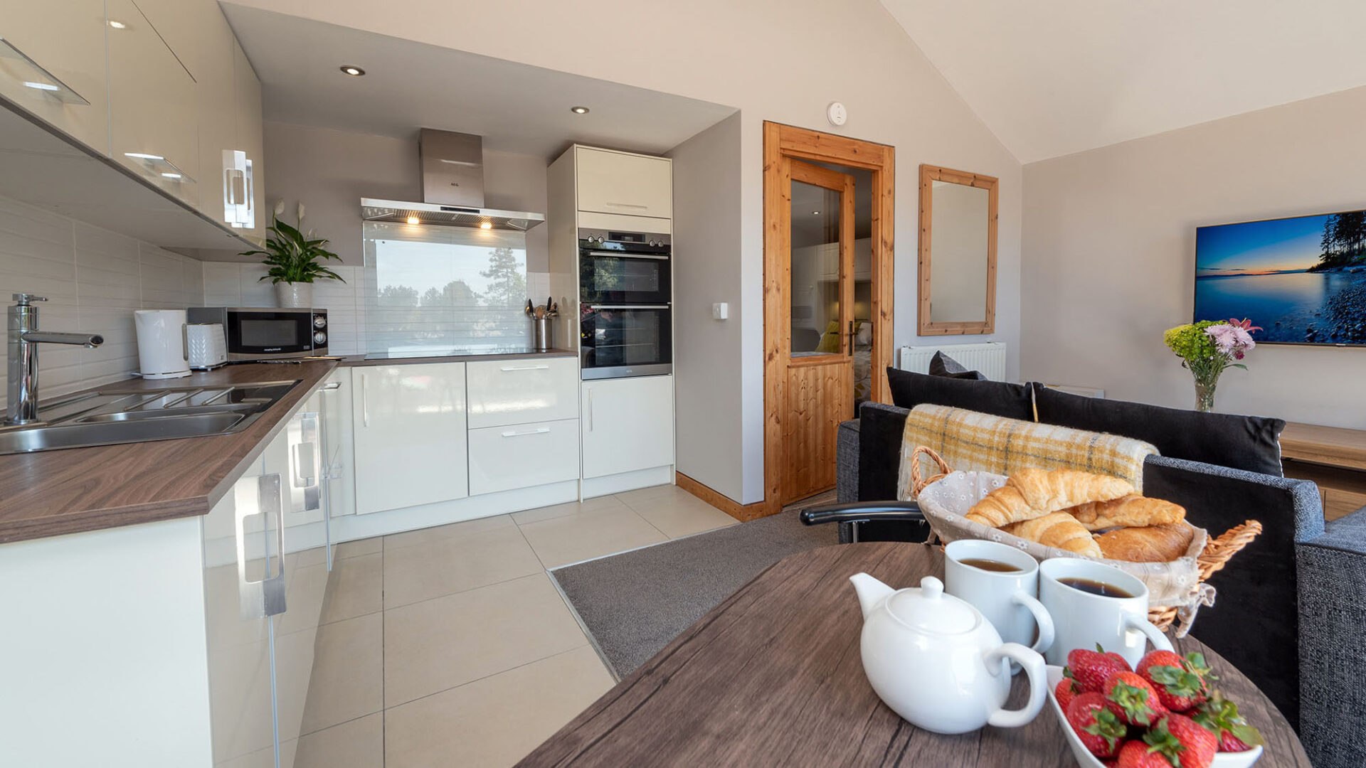 The One Bedroom Lodge with its own private HOT TUB and garden, is set within the grounds, has an outdoor feel to it, containing a large lounge/kitchen area, bedroom and ensuite shower room. A fully fitted kitchen, flat screen TV and free WIFI, quality furniture, outside patio with furniture and views over the garden, best place to watch the sun set. For those wanting to spend a relaxing few days this is a great choice.