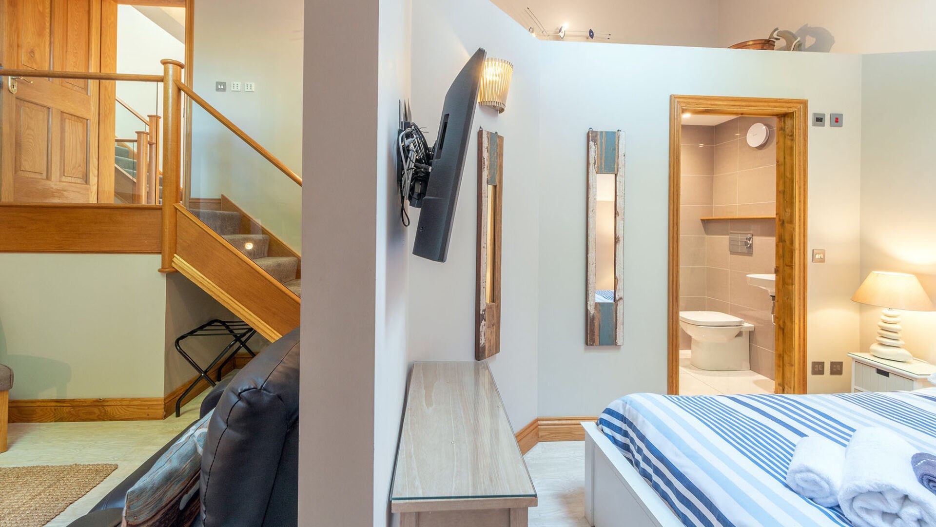Our newest addition which has been created with a seaside feel, rustic furniture enhances the ambience. The room benefits from a separated bedroom area, and with the vaulted ceiling gives a spacious airy feel. Lounge and bedroom both have flat screen TV’s, with free view channels, free WIFI, the lounge area also has a sofa, writing desk and coffee table. There is an ensuite shower room with walk in shower.