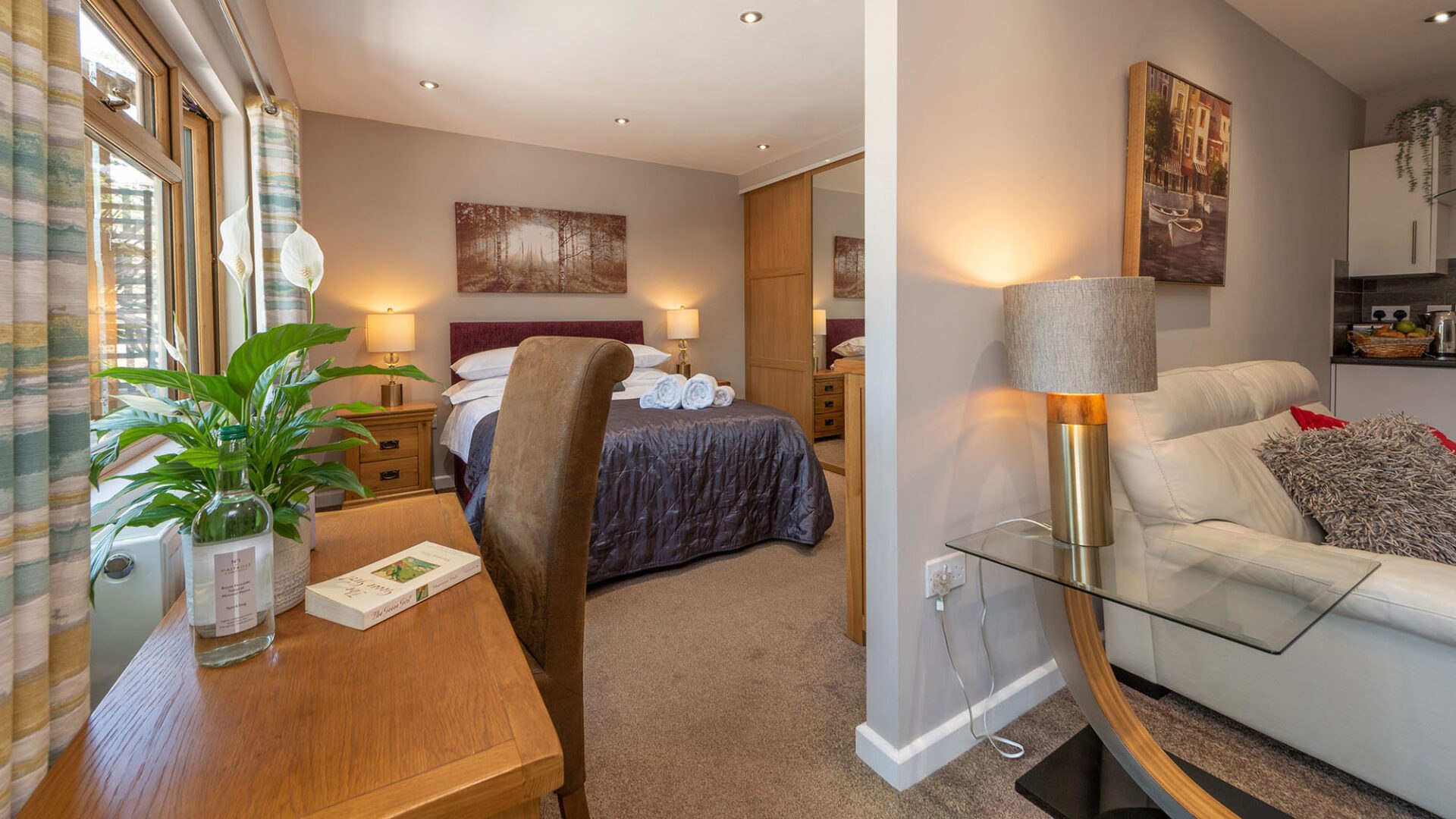 These self-catered apartments are ideal for those wanting to ‘do their own thing’ as they are fully equipped with all that is required for a comfortable stay. Large bedroom with ensuite bathroom and shower cubicle, washing machine, lounge furnished to highest standard with writing desk and kitchen which is fully equipped with cooker, hob, fridge, microwave, cooking utensils, cutlery and crockery. Flat screen TV, with Freeview channels free Wi-Fi. The ground floor studios have a small patio area for outside sitting, all studios have views of the garden and there is ample parking.